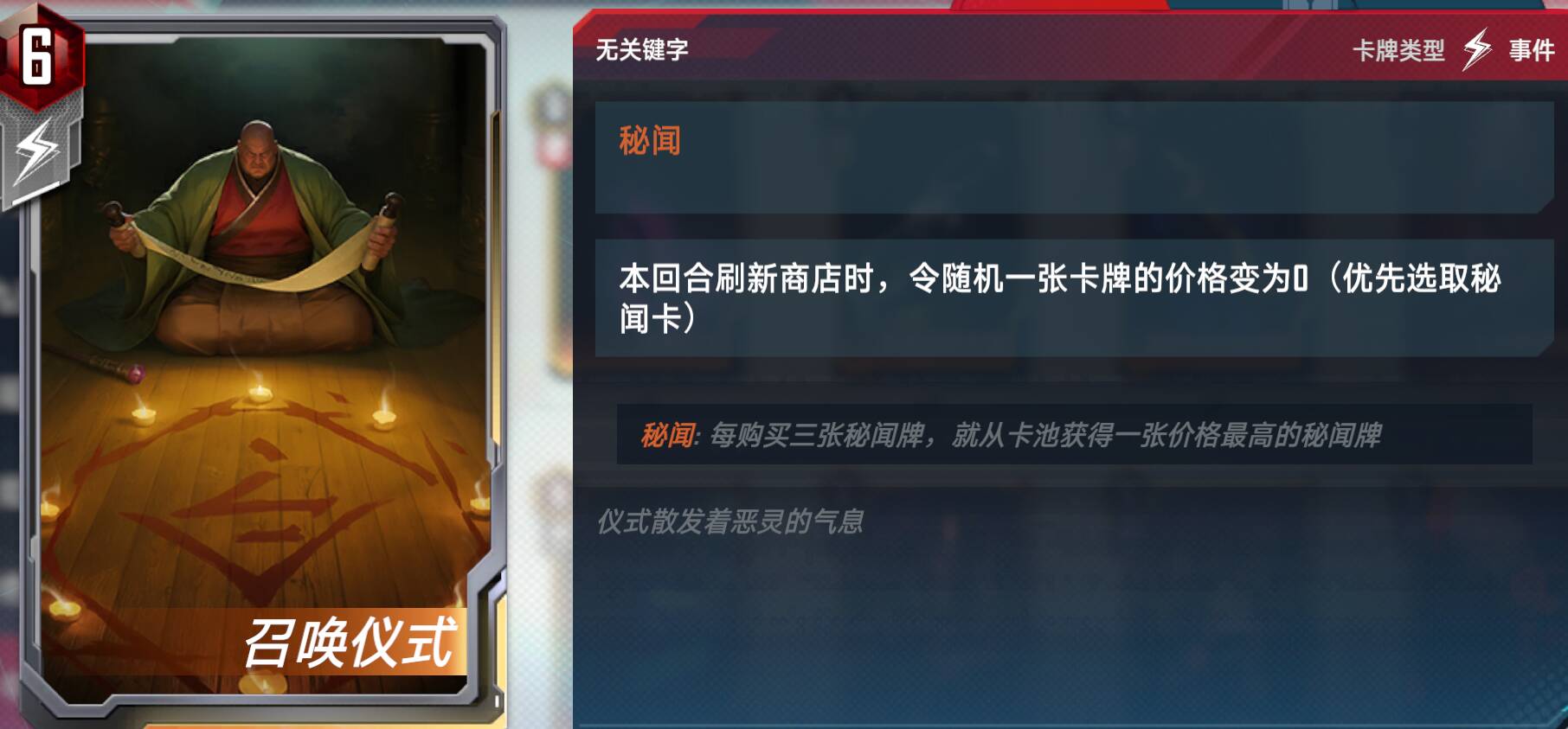1. 打出后全回合生效。如果刷新后有秘闻牌则优先使秘闻牌变0,如果没有则随机1张变0。