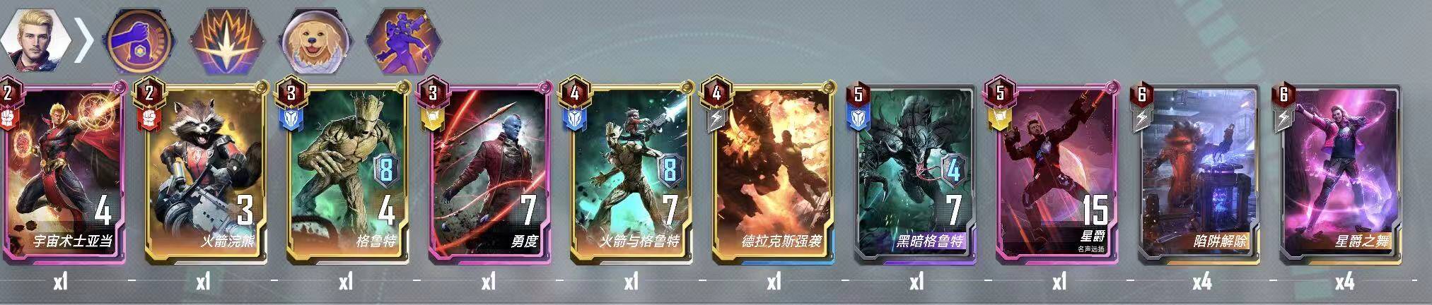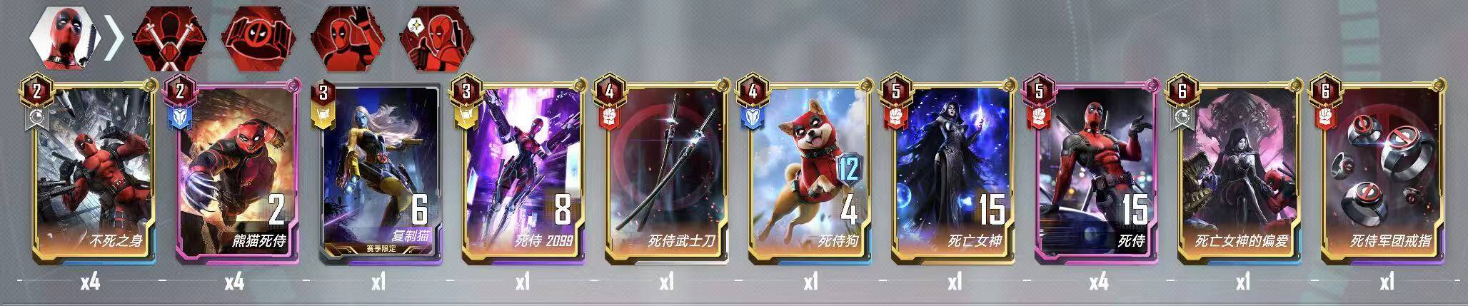 死侍的本家技能就很好,优先选取游戏高手→传送腰带→佣兵协作,再次可以选星爵的高额悬赏,本卡组对技能选取要求并不刻意,所以随意啦。