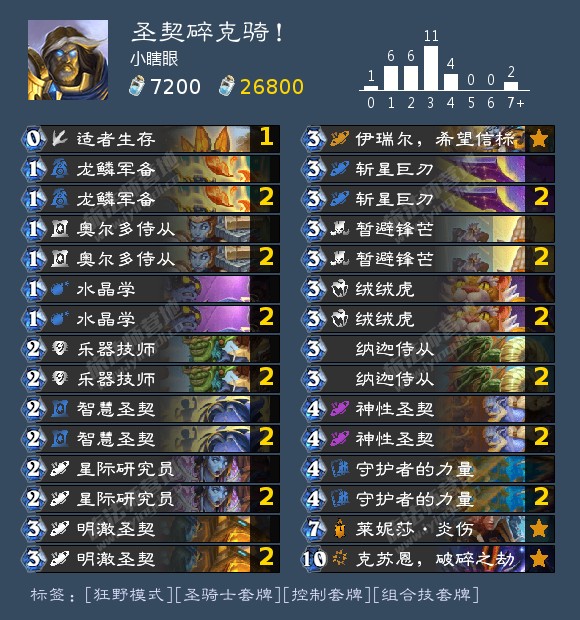 原来是克苏恩啊,我还以为是减速带呢。拼克苏恩尸块一直是一件美事,但现有的卡组苦于找不到碎片和没命打碎片两种极端,圣契骑作为中期压力给满的卡组可以很好的帮拼克苏恩奠定场面优势和抢血,猛猛过牌更增加了抽到碎片的概率和拼完后上手的概率,甚至可以做到拼完之后牌库没牌下回合直接苏醒之日😵! 接下来是一些卡牌取舍:
