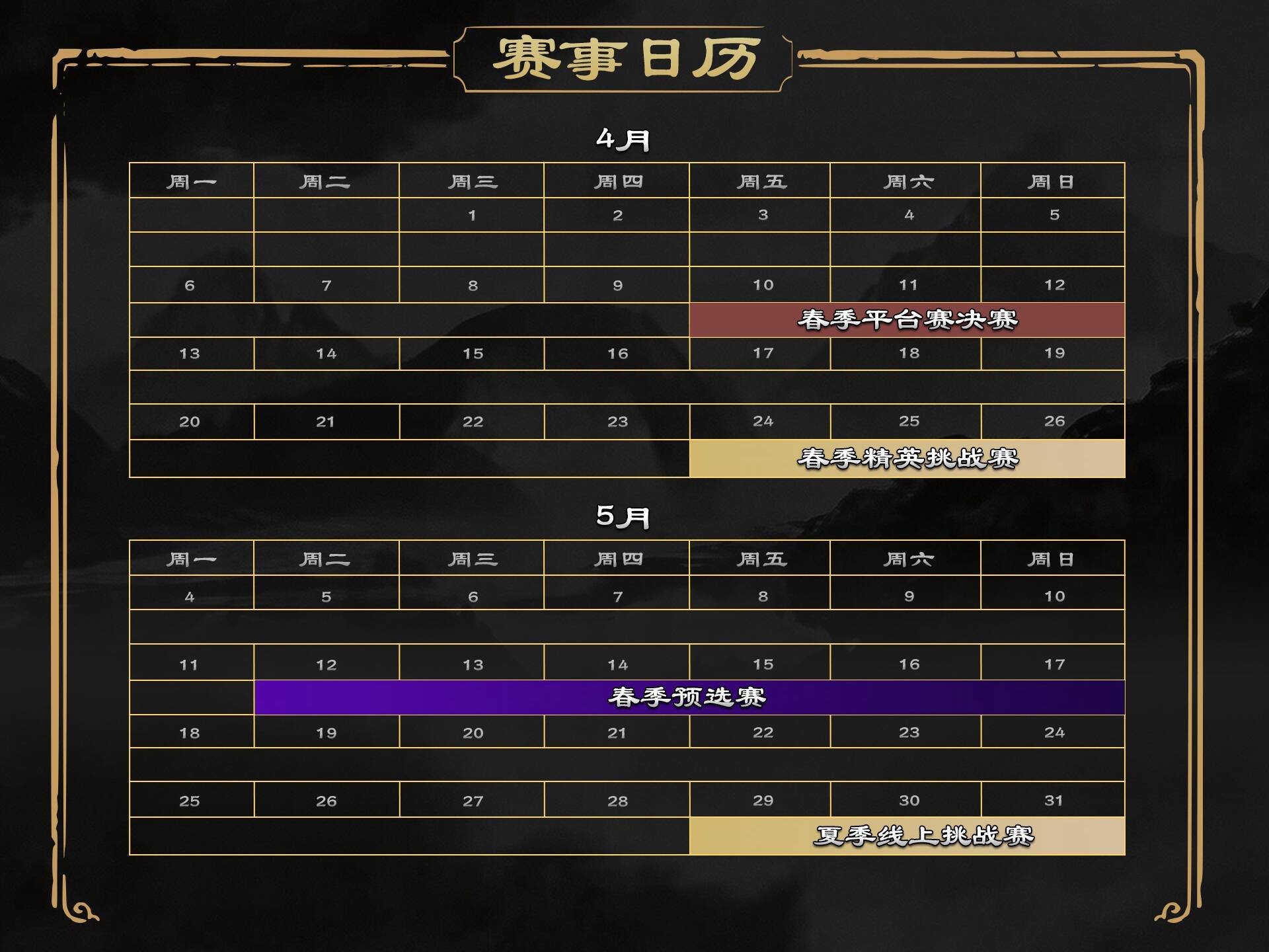 春季预选赛将于北京时间5月12-17日进行,本赛季另两条挑战赛道和(天梯)积分赛道都将在4月底完成选拔。