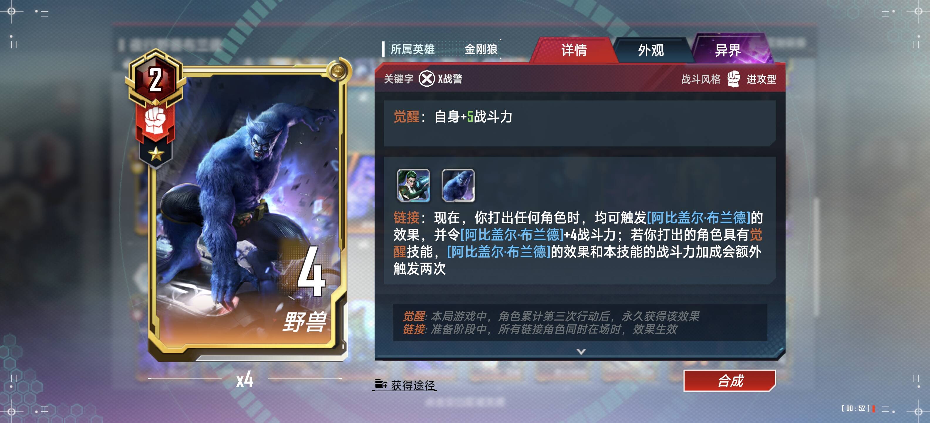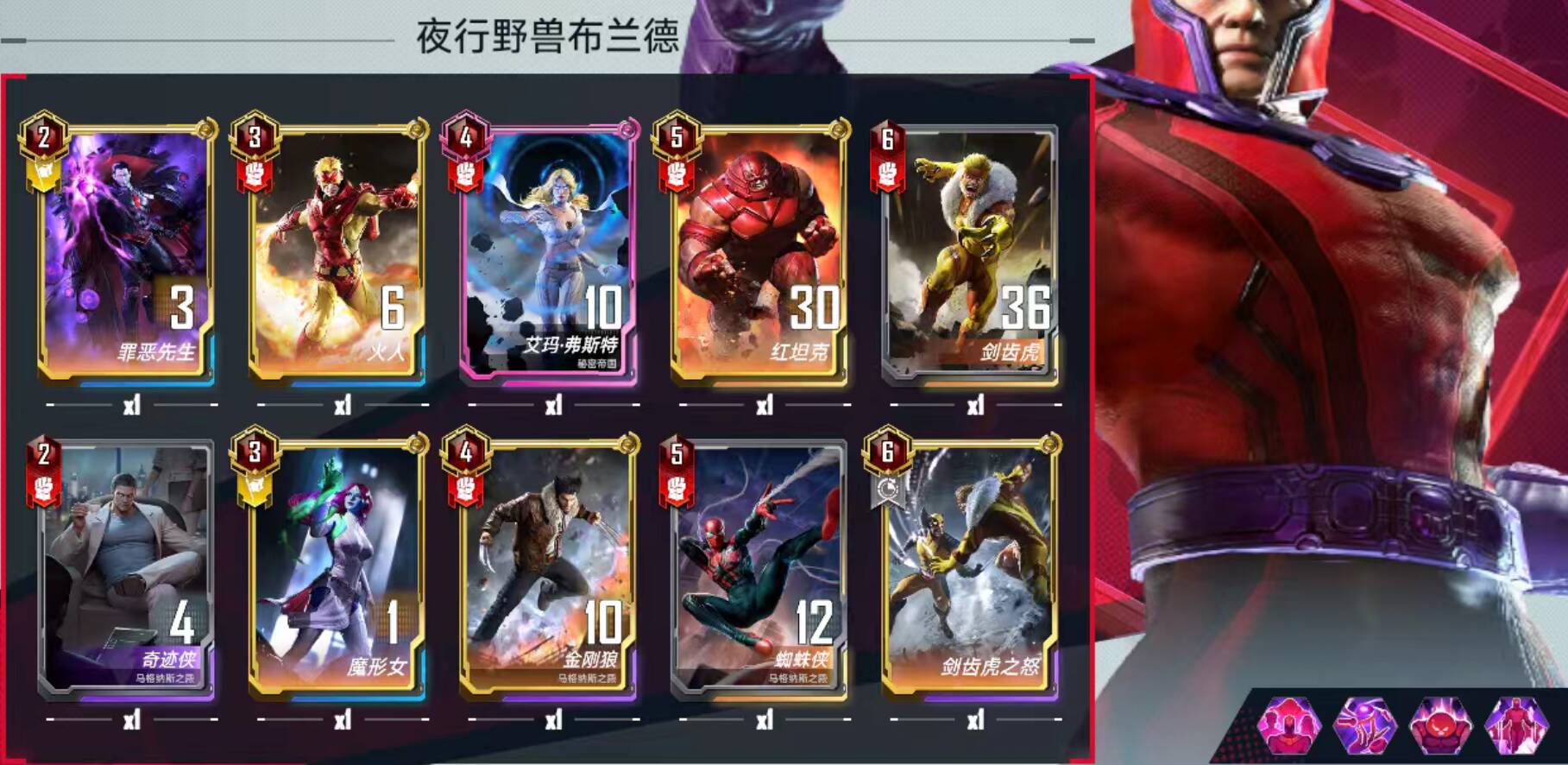 布兰德有个首发,每个回合结束之后除了自身之外的所有不是打出的卡都会回手,所以只要手牌都是觉醒角色,回手之后,再下回合打出回给布兰德涨2次身材(记得野兽先打出去)魔形女可以不急着上,本身就是挂件,优先放2+1布兰德,然后其他觉醒卡