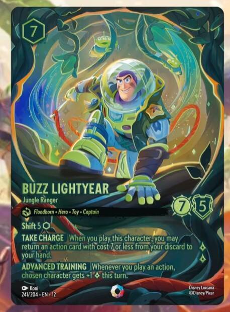 紧随其后的是 Buzz Lightyear, Jungle Ranger(卡号 241)。作为《玩具总动员》的灵魂人物,这张 Iconic 版本的 Buzz 展现了极高的收藏价值。卡面背景中若隐若现的 Aliens(三眼仔)细节满分。Mike 预测,由于该角色在全球范围内的极高人气,其近薄品(Near Mint)的二级市场底价极有可能直接锚定在 1000 美元左右。
