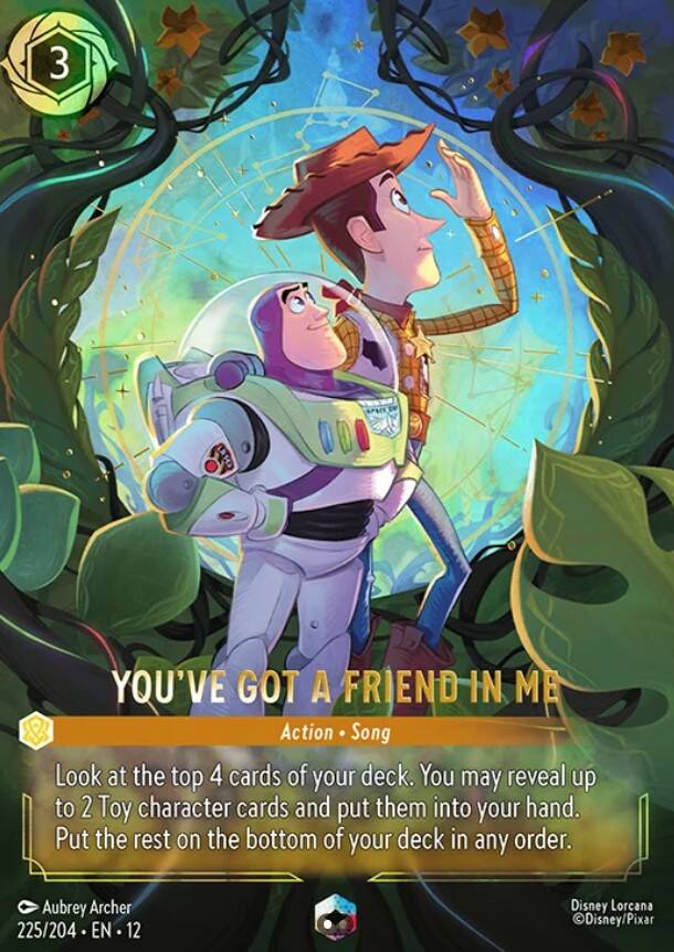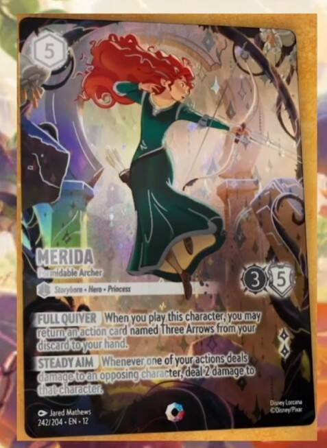 首先是 Merida, Formidable Archer(卡号 242)。由 Jared Matthews 操刀,这张卡的视觉张力令人惊叹。虽然此前坊间一直盛传会有 Buzz 和 Woody 的连画版,但 Merida 的表现力足以回击任何质疑。Mike 特别点赞了卡面上的“Lore Foiling”烫金工艺,尤其是对 Merida 那头标志性红发的纹理处理,色彩饱和度与闪烁效果堪称“厨师之吻(Chef’s Kiss)”级别的完美。
