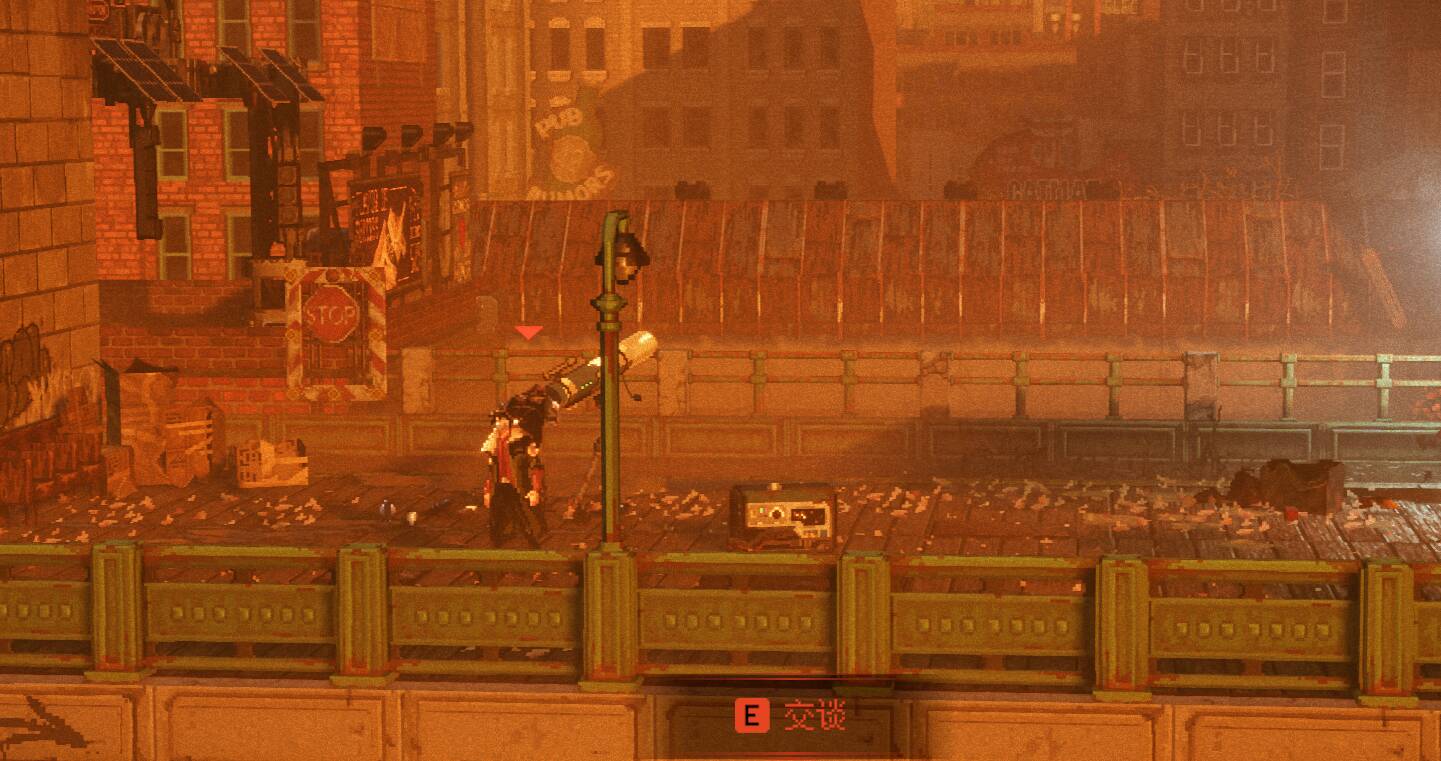 进入战斗教学,红色闪避,黄色反击,作为教学,判定时间还是比较长的,难度不大,通过后进行移动教学,按手柄 Y / 键盘 E 进行互动,若无反应可尝试读档后再操作。跳上箱子,向左连跳两次抓住横杆,登上屋顶,之后跳去右边即可。