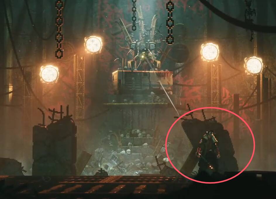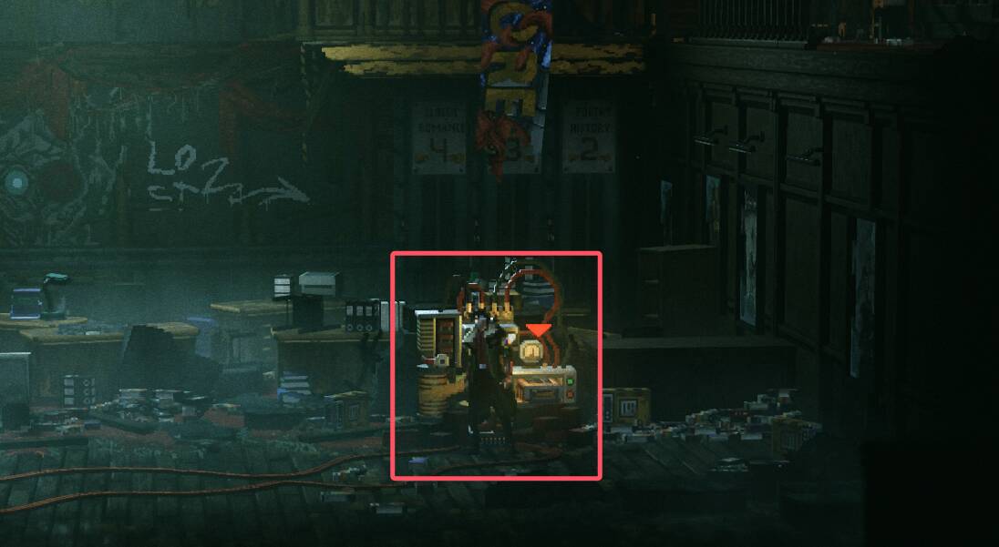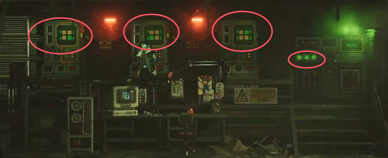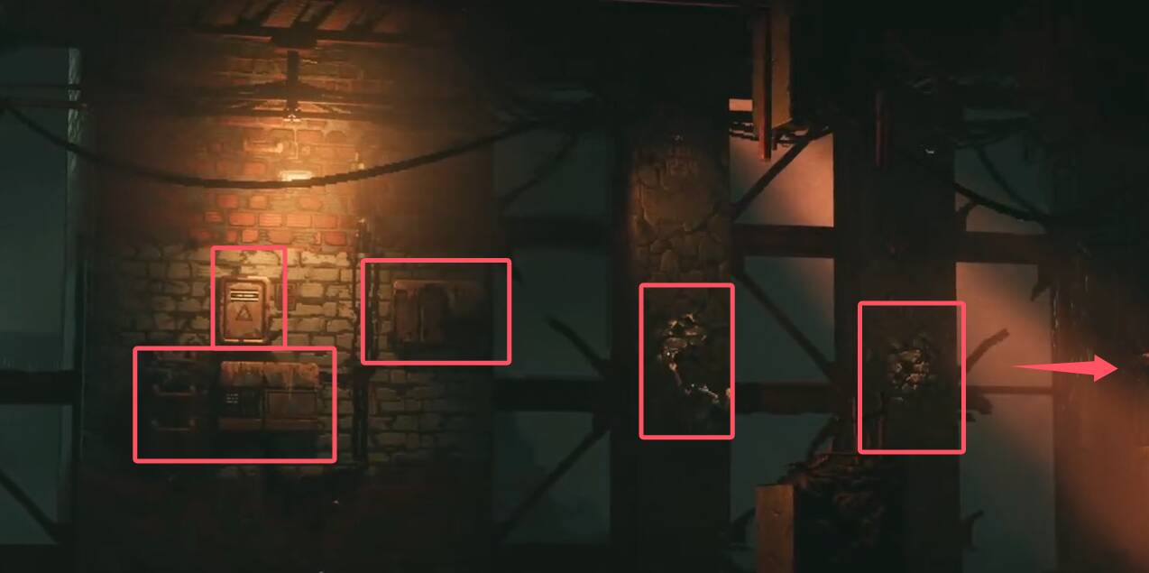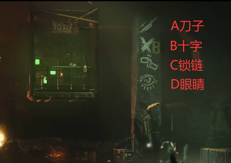 战斗结束后左边拿道具去右边,灯亮就可以停了,先去右边,往左边上层跳。启动机器进行解谜,右边墙上ABCD对应文字,然后根据CADB,就是锁链、刀子、眼睛、十字,转换数字就是4321。