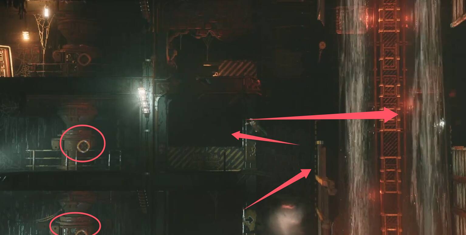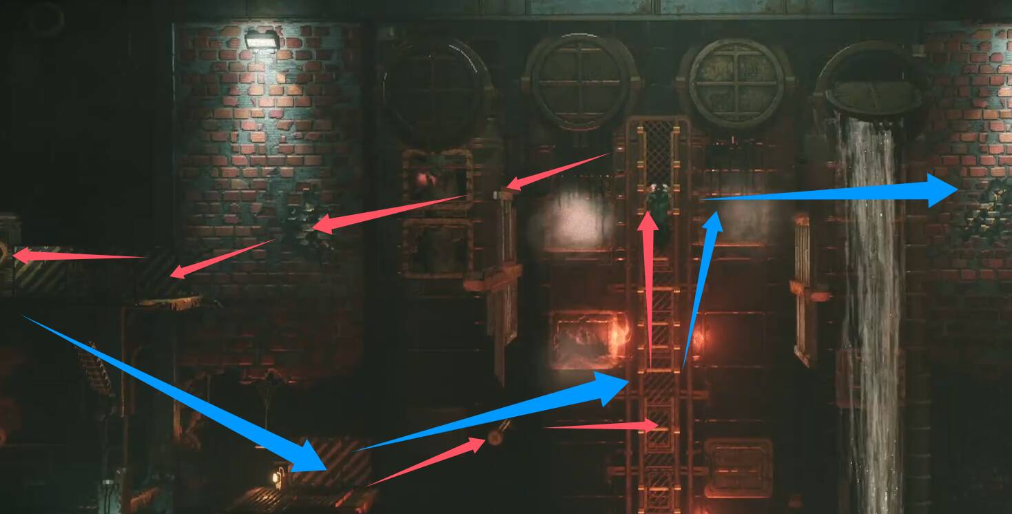 战斗结束后右边上二楼进房间,再次触发战斗。战斗后顺着路走,爬管道,继续往上。