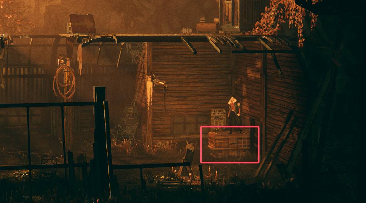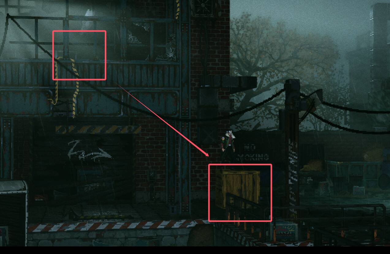 按下升起之后,立马跳上板,就可以上升之后来到这里的二层,之后一路往左。中间需要移动两次箱子到左边,爬上杆子,继续往左。