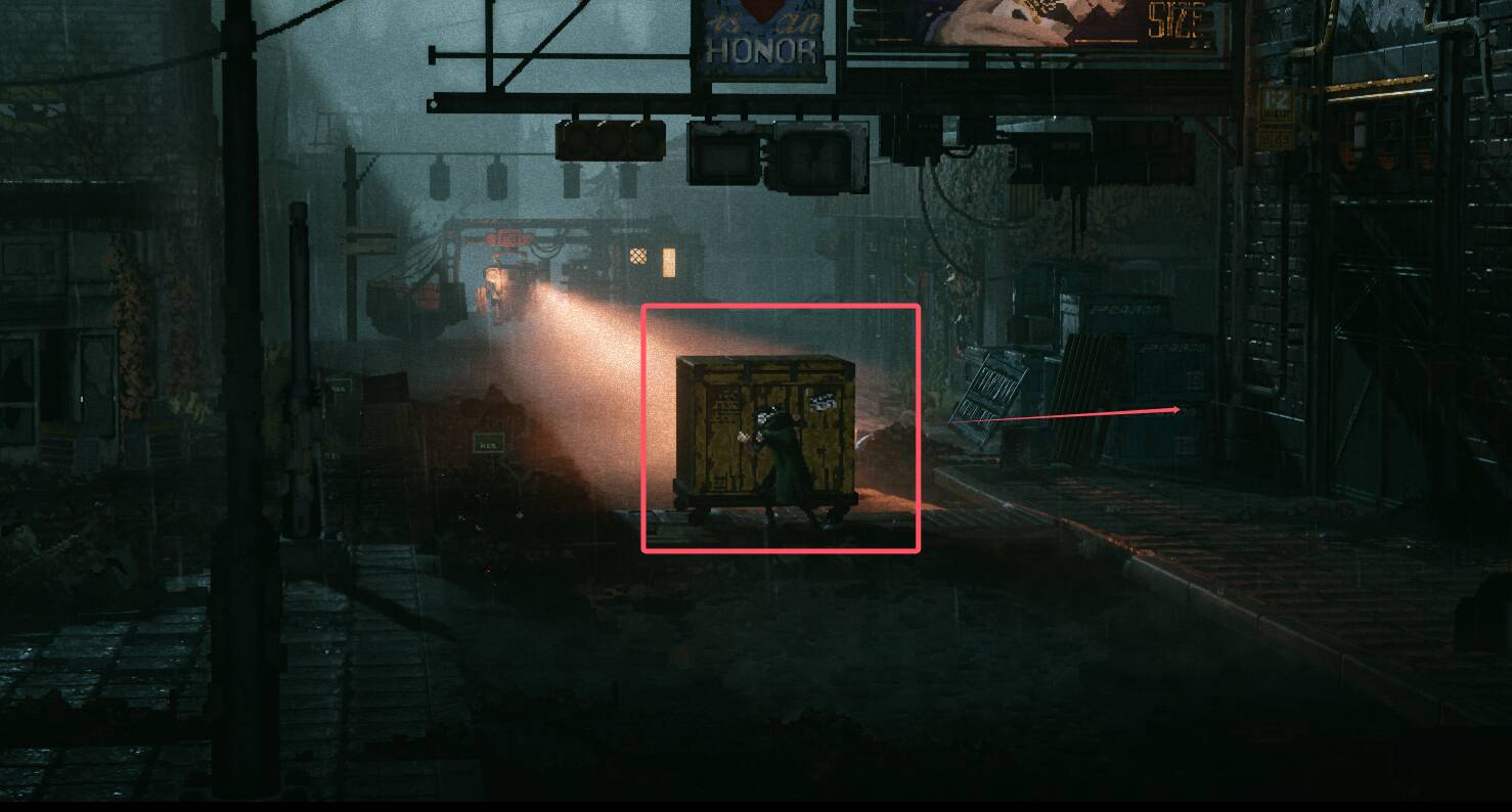 继续往右走,遇到探照灯,这次需要躲在箱子后面,移动箱子前进,必须在灯没有照射到箱子的时候才能移动,否则会被直接射死。