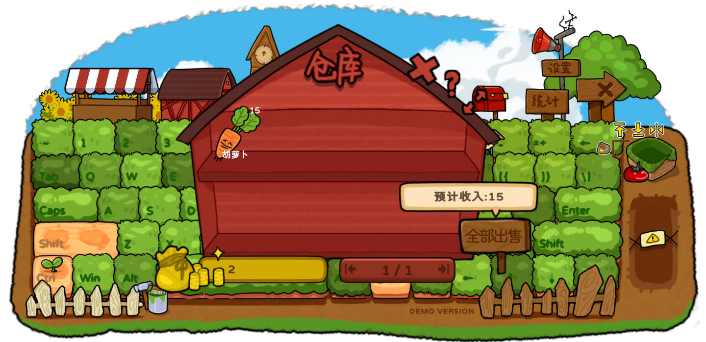 当经过若干次键盘敲击,农作物成熟后,就会自动收获进入仓库。在仓库界面,玩家可以将农作物出售换取资金购买新品种的种子,以及外观装饰等升级内容。
