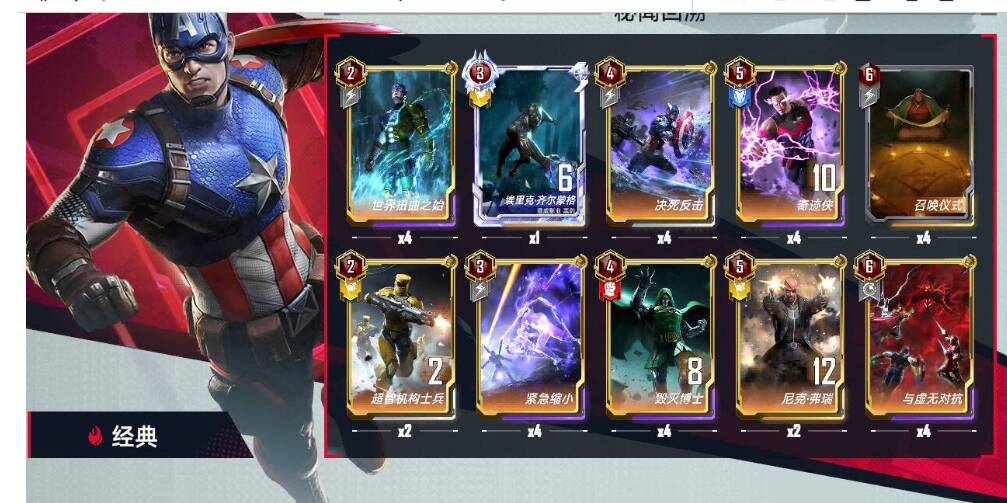 2、中期5-8回合停在5本,用扭曲找卤蛋,女巫,奇迹侠,奇异博士太空装甲。中期通过奇异博士,免费刷新,女巫奇迹侠给界摩托,界王增加战力,一般是奇异博士,奇迹侠,女巫,界摩托,界王,托尼