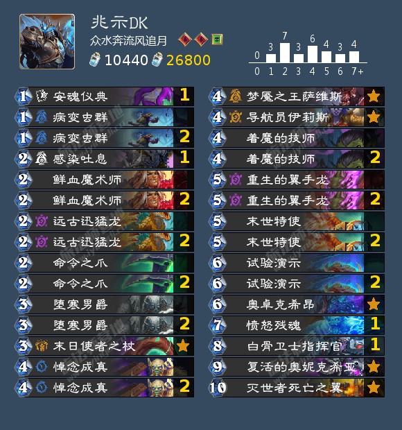 远古迅猛龙。兆示DK的前3费很弱,远古迅猛龙是一张前3费站场不亏的卡,满编填补弱势的前3费。
